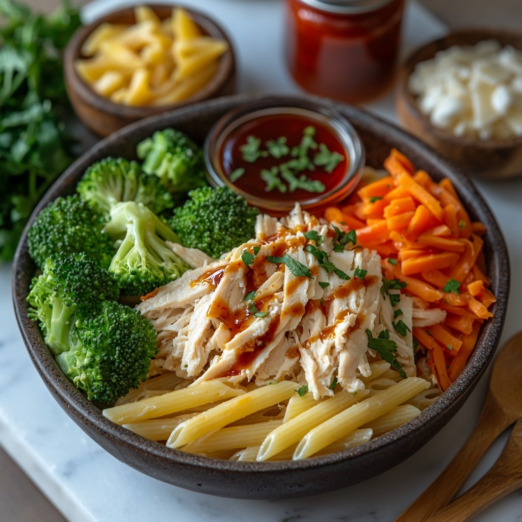 - Combine Ingredients: Add the shredded chicken, cooked pasta, broccoli florets, diced red bell pepper, shredded carrots, and half of the shredded mozzarella cheese to the bowl with the sauce. Stir everything together until well coated. Season generously with salt and pepper to taste.