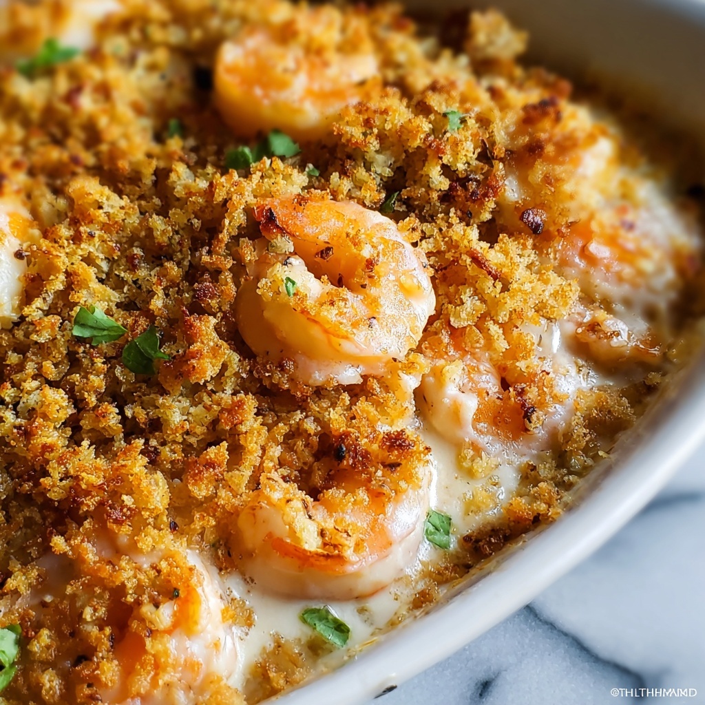 5. Prepare Topping: In a small bowl, melt the butter and mix it with the panko breadcrumbs until the crumbs are fully coated. Sprinkle this breadcrumb mixture evenly over the shrimp mixture in the casserole dish to form a crunchy topping.