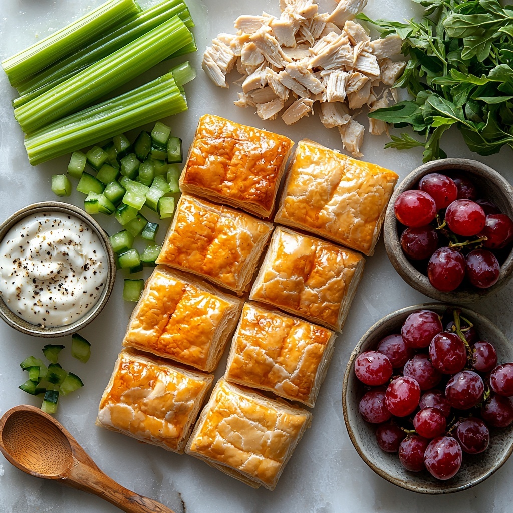 Start by preheating your oven following the guidelines on your puff pastry package — this ensures your puffs bake evenly and develop that gorgeous golden color. While the oven warms up, cook your chicken breasts either by boiling for tenderness or grilling for a hint of smoky flavor. When cooked through, allow them to cool completely before shredding; this step is key for the filling’s texture.