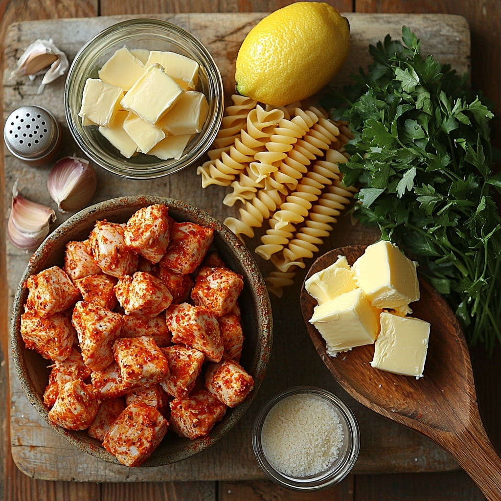 Gathering the right ingredients is the foundation of this Juicy Lemon Cajun Chicken Bites with Creamy Alfredo Twists Recipe. Each one adds an essential note—whether it’s spice, creaminess, or freshness—that harmonizes beautifully in the final dish.