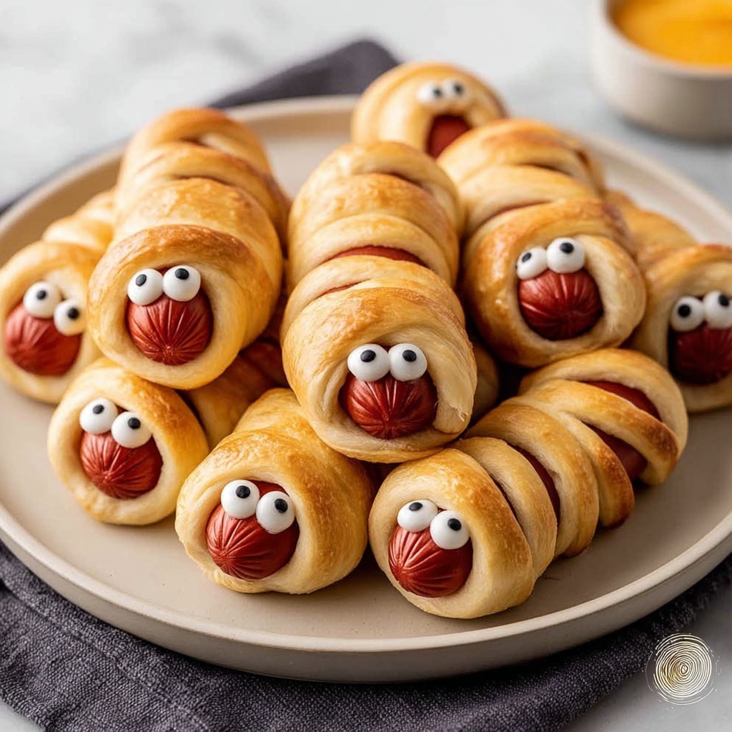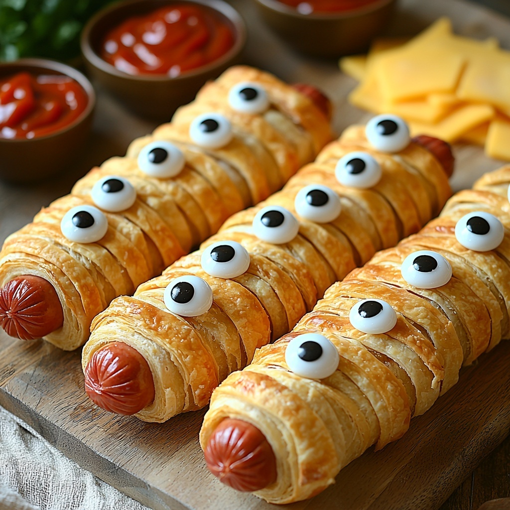 Mummy Hot Dogs are a fun and festive Halloween-inspired snack featuring hot dogs wrapped in crescent roll dough to resemble mummies. Baked to a golden brown and adorned with candy eyes, these spooky treats are perfect for parties or a playful family snack served with ketchup or mustard.