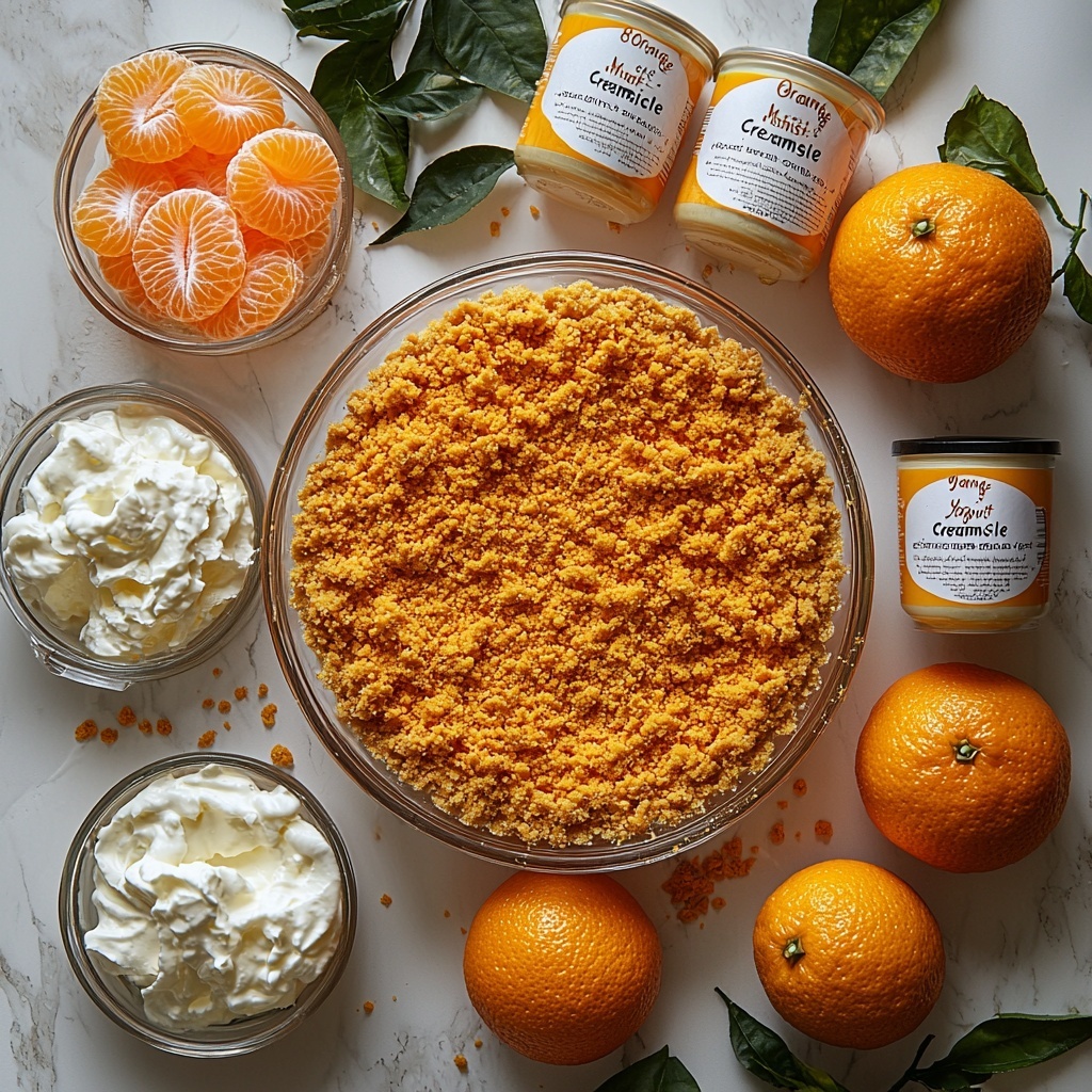 This recipe calls for a handful of simple yet essential ingredients, each playing a crucial role in building the pie’s delightful texture and flavor. From the zing of mandarin oranges to the creamy body of orange yogurt and the airy whipped cream, every item works harmoniously to create that signature creamsicle taste and appearance.