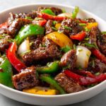 This Pepper Steak recipe features tender slices of flank or sirloin steak stir-fried with vibrant bell peppers and onions in a savory, slightly sweet Asian-inspired sauce. Enhanced with garlic, fresh ginger, and a hint of sesame oil, this quick and easy stovetop dish is perfect for a satisfying weeknight dinner served over steamed rice or noodles.